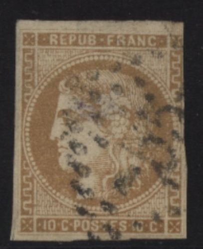 1870 Mi.Nr. 40a , 10 Centimes gelbbraun, gut gerandet, rechts oben angeschnitten, rückseitiger Tintenfleck. G-C-Stempel "55" geprüft "Prof. Schollmeyer". Mi.(70.--)Euro.