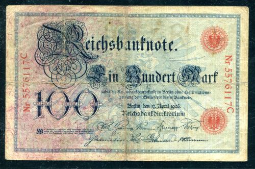 LIQUIDATIONSPOSTEN.1903 Reichsbanknote 100 Mark. Rosenberg Katalog Nr. 20 mehrmals gefaltet.