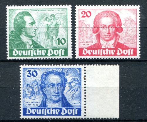 1949 Mi.Nr. 61/63 , Johann Wolfgang von Goethe, 30 Pfennig mit Seitenrand und mit Plattenfehler 63I Farbpunkt links neben "J", kompletter Satz. Mi.(360.--Euro).