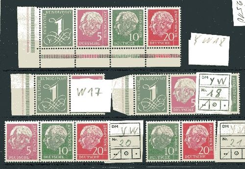 1958 Mi.Nr. W17Y, W18Y 2 mal, W20Y, W21Y , Heuss. 5 Zusammendrucke.