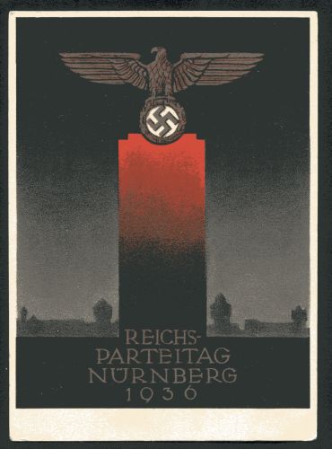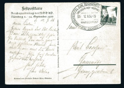 1936 Festpostkarte Reichsparteitag der NSDAP in Nürnberg 8-14. September 1936. Farbkarte echt befördert mit SSt. "Marschpost Dresden-Hof-Nürnberg 12.9.36.", in feiner Erhaltung. Mit diesen Tempel sehr SELTEN!!!