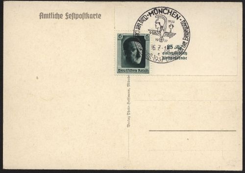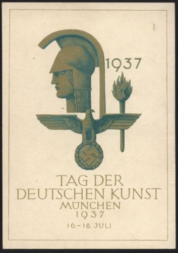 1937 Festpostkarte "Tag der Deutschen Kunst München 16.-18. Juli 1937" mit entsprechendem Sonderstempel auf rechter oberen Marke aus Block 7, nicht befördert, in feiner Erhaltung.