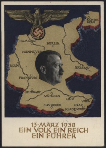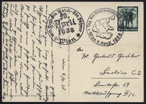1938 EIN VOLK EIN REICH EIN FÜHRER 13. März 1938 mit Marke Nr. 662 mit Stempel "Wien 9. April 1938 Tag des Großdeutschen Reichs mit Kartenabbildung", sowie Zusatzstempel "Wien 10. April 1938 E.V.E.R.E.F". Echt befördert nach Berlin C2, in guter Erhaltung.