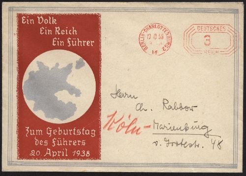 1938 Ein Volk Ein Reich Ein Führer. Sonderumschlag "Zum Geburtstag des Führers 20. April 1938". Mit Freistempel 3 Pfg. in rot und Stempel in rot Berlin - Charlottenburg 2 bf 19.10.39 echt befördert nach Köln - Marienburg, in guter Erhaltung.