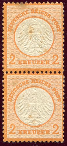 LIQUIDATIONSPOSTEN. 1872 Mi.Nr. 8 , senkrechtes Pärchen, 2 Kr. mit kleinem Brustschild, kl. braune Flecken, 1 Zahn kurz. Mi.(1500.--)Euro.