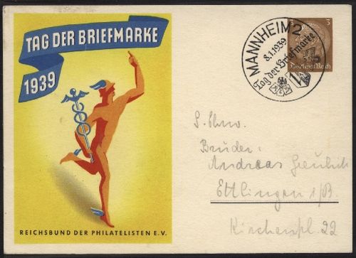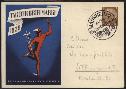 1939 P 239/01 und 239/02 , 2 verschiedene Karten jede mit Sonderstempel Mannheim 2 / Tag der Briefmarke / 8.1.1939 in tadelloser Erhaltung.