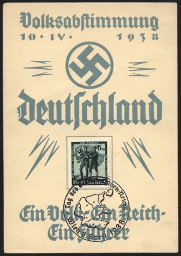 1938 Volksabstimmung 10.IV. mit Marke Mi.Nr. 663 und Sonderstempel Wien 9. April 1938. "Ein Volk - Ein Reich - Ein Führer". Rückseite 4 Falze, in guter Erhaltung.