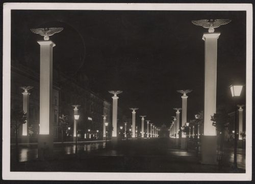 1937 BERLIN BEI NACHT. UNTER DEN LINDEN MIT FESTBELEUCHTUNG. Mit 6 Pfg. Hindenburg und Sonderstempel" Berlin Charlottenburg 4.10.37" echt befördert nach Seestadt Rostock, in guter Erhaltung.