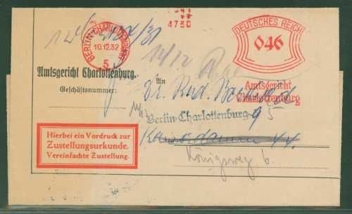 1932 Amtsgericht Charlottenburg, Freistempel 046 Pfennig, Berlin Charlottenburg 10.12.32 in rot, mit rotem Eindruck 3 Zeilen "Hierbei ein Vermerk zur / Zustellungsurkunde. / Vereinfachte Zustellung", befördert nach Berlin = Charlottenburg, rs. Siegelmarke "PREUSS. AMTSGERICHT CHARLOTTENBURG".
