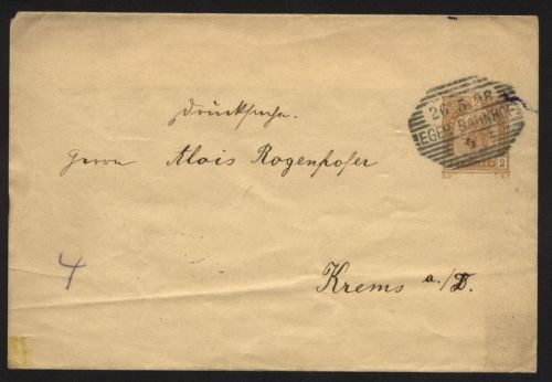 1898 Ganzsachenbrief mit 2 Kreuzer und Stempel EGGER BAHNPOST 26.5.98 nach Krems, rs. Ankunftstempel BESTELLT 27.5.98 Krems an der Folnau und 3 Zeilenstempel "Der Sammler" Zeitschrift für Sammlerwesen, Sport, Verkehr und Tourismus.