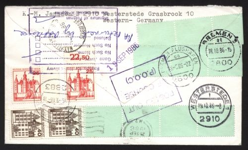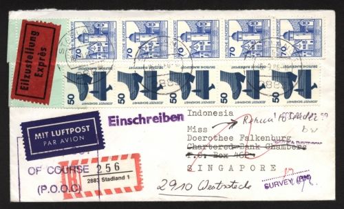 1986 Mi.Nr. 700 , 50 Pfennig Unfallverhütung Endstreifen 54. Mi. 917 BS. 70 Pfennig 54. Mi.Nr. 915 40 Pfennig 24, alle Lf. (helltürkis). Außerdem 2 Marken Berlin 25 Pfennig BS mit Rand. R-Brief, Eilzustellung, , ab Stadland 16.9.86 nach Singapur, mit Ankunftstempel und Zurück. Durchgangsstempel 18.10.86 Bremen und 19.10.86 Westerstede. Interessanter Beleg.
