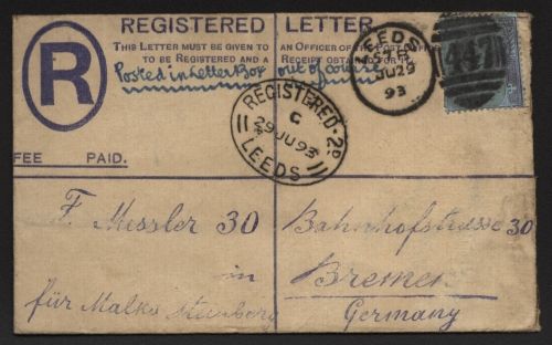1892 Großbritannien. Vereinfachter Vordruck "REGISTERED LETTER" EU 15A mit Gebührentafel, Format 133x83 mm, zusätzlich Mi.Nr. 89 , 2 1/2 Penny, ab "LEEDS Ju 29.93 nach Bremen, Deutschland.