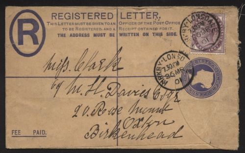 1898 Großbritannien. Vereinfachter Vordruck "REGISTERED LETTER" EU 20A mit Gebührentafel, Format 133x83 mm, Zusatzfrankatur 1 Penny, ab "KIRKBYLONSDALE".