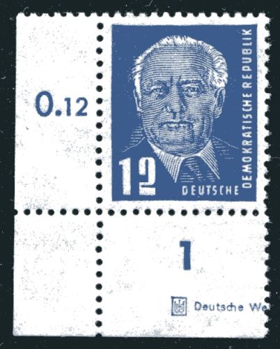 1950 Mi.Nr. 251 , 12 Pfennig linke Bogenecke mit Druckerzeichen (DZ1). Rückseite am Bogenrand schwarze Haftstellen von schwarzer Steckseite, sonst Mi.(200.--)Euro.