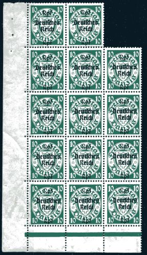 1939 Mi.Nr. 720 , 10 Rpf auf 10 Pfennig, Freimarken von Danzig mit Aufdruck im 14er Block aus Bogenecke unten links. Am Bogenrand leichte Schürfstellen. (112.--)Euro.