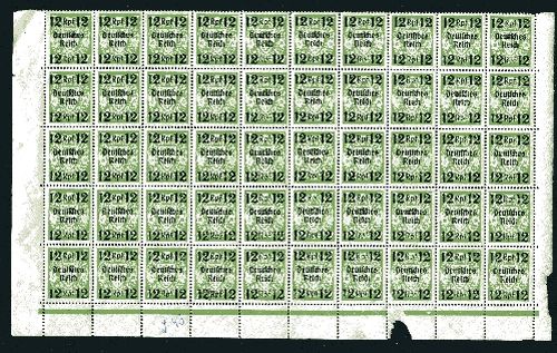 1939 Mi.Nr. 721 , 12 Rpf auf 7 Pfennig, Freimarken von Danzig mit Aufdruck im 50er Block. Ein halber Bogen vom Unterteil. Bogenrand teils fehlerhaft und 5 kleine braune Punkte auf Gummiseite. Mi.(300.--)Euro.