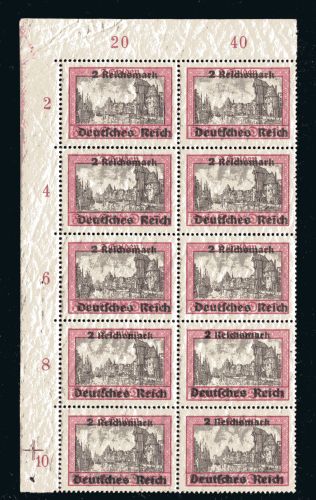 1939 Mi.Nr. 729 , 2 RM auf 2 Groschen. Freimarken von Danzig mit Aufdruck im 10er Block aus der rechten oberen Bogenecke. Mi.(800.--)Euro.
