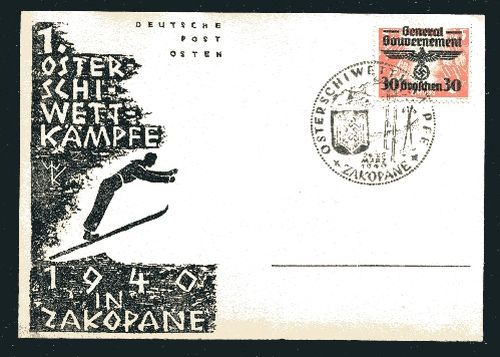 1940 1. Oster - Schi - Wettkämpfe in ZAKOPANE mit Sondermarke und gleichlautenden Sonderstempel ZAKOPANE 24./25. März 1940 nicht befördert. Unten minimal braun getönt.