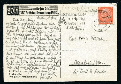1941 WILLRICH Kradmelder einer Panzer - Vorausabteilung, mit 6 Pfennig Hitler, ab Dresden 27.7.41 nach Odenbach.