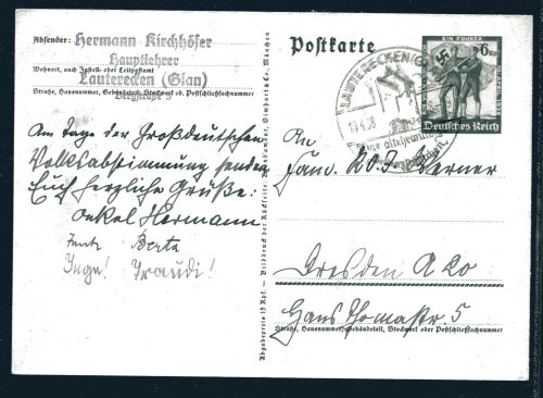 1938 EIN VOLK EIN REICH EIN FÜHRER. Ganzsachenkarte Nr. P 268 ab Lauterecken 10.4.1938 befördert nach Dresden. TOP Erhaltung.