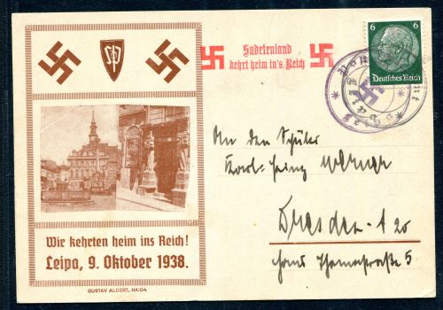 Sudetenland kehrt heim in's Reich als roter Stempel mit Hakenkreuz an beiden Seiten. Leipa 9. Oktober 1938 Fotokarte, befördert nach Dresden.