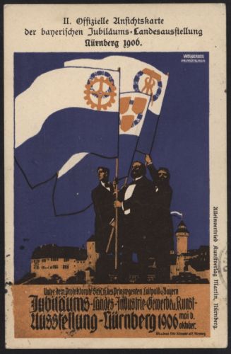 II. Offizielle Ansichtskarte der bayerischen Jubiläums - Ausstellung NÜRNBERG 1906. Ganzsache mit Bayern 5 Pfg. und Stempel NÜRNBERG 28.8.05 echt befördert nach Cassel, mit Ankunftstempel Cassel 29.8.05. Vorne leichte Stempelspuren.