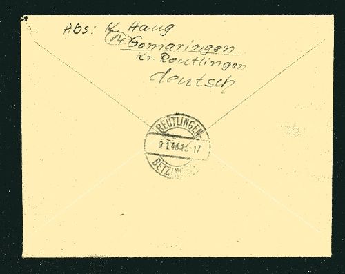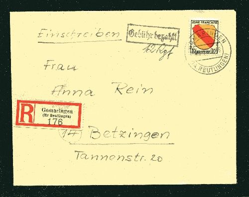 1945 Mi.Nr. 10 , , EF, 30 Pfennig und Kastenstempel "Gebühr bezahlt" 12 Rpf. handschriftlich, auf R-Brief ab Gomaringen (Kreis Reutlingen) 7.1.46. nach Betzingen, mit Ankunftstempel 9.1.46.