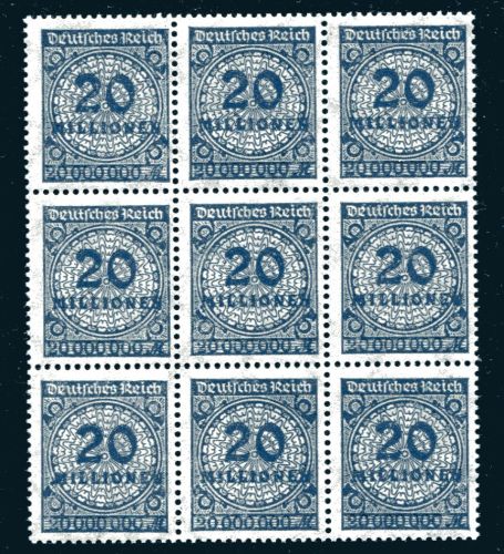 1923 Mi.Nr. 319Awb , 20 Mio. schwarzblau im 9er Block, jede Marke "INFLA geprüft" Mi.(360.--)Euro.