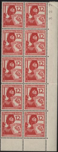 1937 Mi.Nr. 645 , 12 Pfennig Luftschutz, Höchstwert im 10er Block aus Bogenecke unten rechts. Mi.(80.--)Euro.