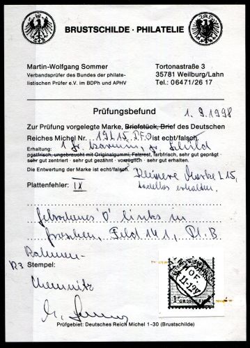 LIQUIDATIONSPOSTEN. 1872 Mi.Nr. 19 , IX. 1 Groschen mit großem Schild und Plattenfehler IX, sauber gestempelt. Fotobefund "Sommer", tadellos. Mi.(350.--)Euro.