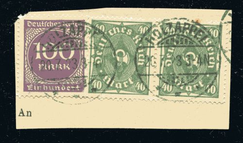 LIQUIDATIONSPOSTEN. 1922 Mi.Nr. 232 , , , 40 Pfennig Freimarke Posthorn mit Zusatzfrankatur Nr. 268 auf Briefstück, geprüft INFLA. Pracht. Mi.(140.--)Euro.