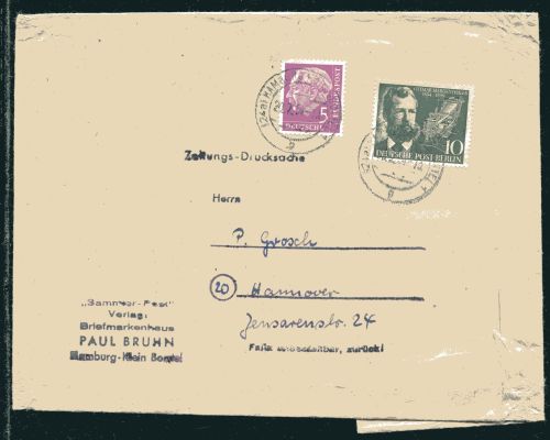 1954 Mi.Nr. 179x Heuss 5 Pfennig Bundesrepublik und Berlin Nr. 117 Mergenthaler 10 Pfennig, als Zeitungs - Drucksache ab Hamburg 22.7.54 nach Hannover.