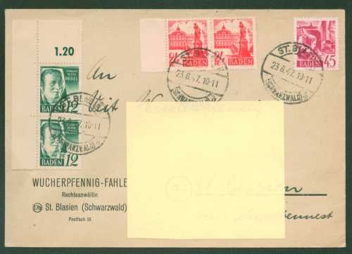 1947 Mi.Nr. 4 , senkrechtes Pärchen aus Bogenecke oben links. Nr. 8 mit Seitenrand links und Nr. 9 Einzelmarke, ab St. Blasien 23.8.47 als Ortsbrief.