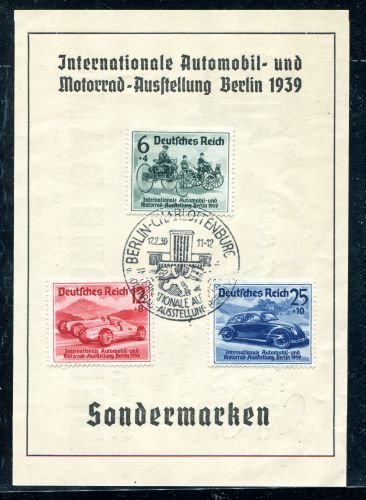 1939 Mi.Nr. 686/88 /, Internationale Automobil- und Motorrad - Ausstellung, kompletter Satz mit Ersttags - Messestempel auf Sonderblatt "Deutsche Bank".