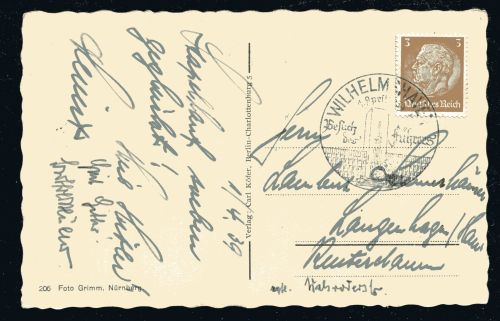 1939 Adolf Hitler Selbstbildnis Sonderkarte mit 3 Pf. Hindenburg ab Wilhelmshaven 1. April 39 "Besuch des Führers", befördert nach Langenhagen Hannover.