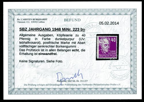 LIQUIDATIONSPOSTEN. 1948 Mi.Nr. 223by , 40 Pfennig dunkelpurpur (UV: lebhaftrosarot) mit Abart vollflächiger senkrechter Borkengummi. Die Marke ist echt, die Erhaltung einwandfrei. Fotobefund "Dr. CARSTEN BURKHARDT" Mi.(400.--Euro).