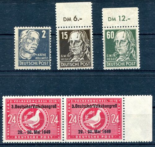 LIQUIDATIONSPOSTEN. 1948 Mi.Nr. 212, 217 Oberrand, 225 Oberrand alle , letztere 60 Pfg. geprüft "PAUL", dazu Mi.Nr. 233 mit Abart II im mit Normalmarke vom rechten Bogenrand, geprüft "Paul". Mi.(265.--)Euro.