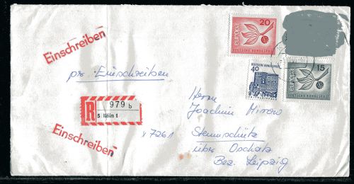 LIQUIDATIONSPOSTEN. 1965 Mi.Nr. 479 , , 20 Pfennig, 20 Jahre Vertreibung, grau übermalt, mit Zusatzfrankatur auf R-Brief, ab Köln nach Stemmschüz.