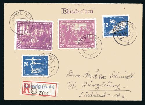 1950 Mi.Nr. 246/47 und 248/49 /, Wintersport und Leipziger Messe. 2 Sätze auf R-Brief ab Coswig nach Würzburg, mit Coswig - Tagesstempel 15.03.1950 und rs. Ankunftstempel.