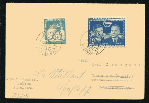 1951 Mi.Nr. 296, 298, /, Deutsch - sowjetische Freundschaft und Wintersport MiF, ab Zehren 15.2.52 nach Urach Württ., weitergeleitet nach Stuttgart.