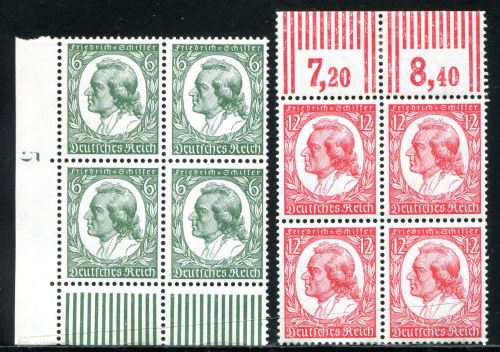 1934 Mi.Nr. 554/55 , , Eckrandviererblock 6 Pfennig unten links, mit Bogennummer "5". 12 Pfennig mit Oberrand, minimale Punkte im Gummi. Mi.(440.--)Euro.