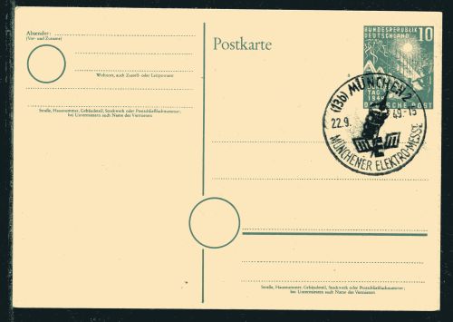 1949 P9 , 10 Pfennig Ganzsache mit Sonderstempel "Münchener Elektro-Messe", ohne Anschrift.