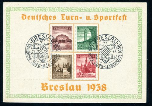 1938 Mi.Nr. 665/68 , auf Sonderkarte "Deutsches Turn- und Sportfest Breslau 1938 mit 2 Sonderstempel vom 31.7.1938 nicht befördert.