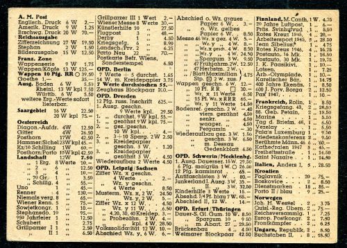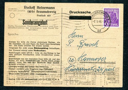 1948 Drucksache mit Sonderangebot auf der Rückseite über Briefmarken zu Sonderpreisen, sehr interessant und wohl selten noch zu finden, frankiert mit Mi.Nr. 944 II. Kontrollausgabe 6 Pfennig (Planzer) befördert als Drucksache ab Braunschweig 7.1.48 nach Hannover. Sehr gut erhalten.