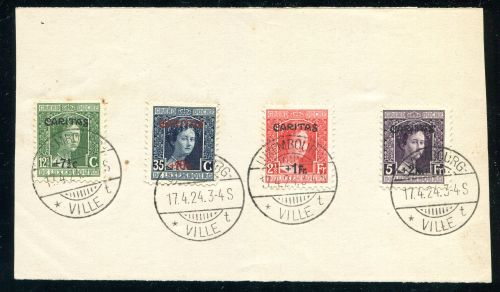 1924 Mi.Nr. 148/51 , Tod der Großherzogin Adelheid, mit schwarzem oder rotem Aufdruck "Caritas und Zusatzwert", mit Ersttagsstempel vom 17.4.24 auf einer Vorlage, Nr. 148 kl. brauner Fleck. Mi.(450.--)Euro.