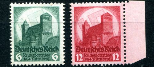 1934 Mi.Nr. 546/47 , Reichsparteitag in Nürnberg, 12 Pfennig mit Seitenrad rechts, kompletter Satz. Mi.(85.--)Euro.