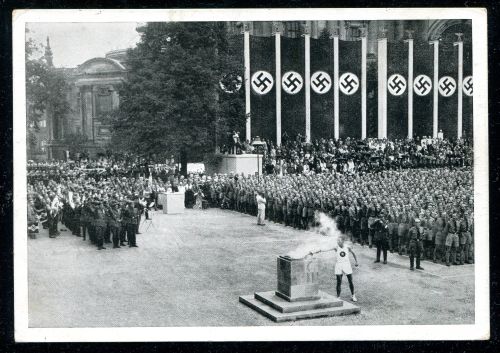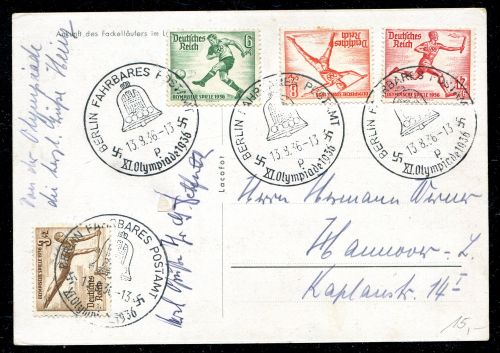 1936 Ankunft des Fackelläufern, frankiert mit 4 Olympia Werte und 4 Sonderstempel vom 13.8.36 BERLIN FAHRBARES POSTAMT.