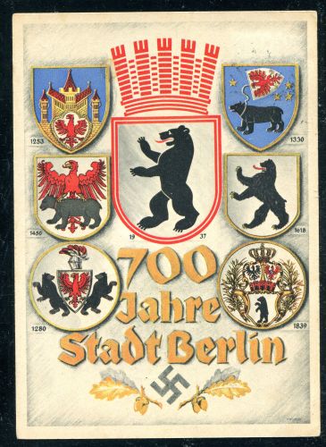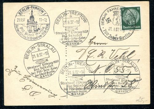 1937 700 Jahre Berlin mit 6 Pfennig Hindenburg, Ortskarte nach Berlin 55, mit 5 Sonderstempel zur 700 Jahr Feier, Sonderstempel vom 21.8.36 BERLIN FAHRBARES POSTAMT. TREPTOW. PANKOW 1. STRALAU