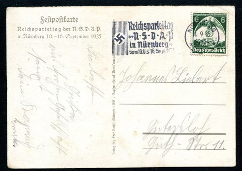 1935 Reichsparteitag der NSDAP in Nürnberg 10.-16. September 1935, mit passenden Sonderstempel, befördert nach Gütersloh.