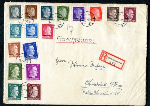 1941 Ukraine Mi.Nr. 1/17 Deutsche Besetzung Deutsches Reich Mi.Nr. 781-797 mit Aufdruck "Ukraine", auf R-Brief ab Dnjepropetrowk 12.6.42 nach Osnabrück. Rückseite mit Ankunftstempel 17.6.42